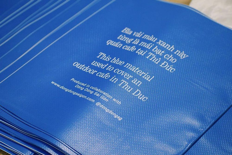 Dong Dong Sai Gon은 사용된 타포린이나 폐타포린을 이용해 재활용 핸드백을 생산하는 브랜드이다. 2022년 10월, Pizza 4P’s는 Dong Dong Sai Gon과 협력하여 Pizza 4P의 새 매장을 위한 재활용 타포린으로 만든 메뉴, 영수증 커버, 장바구니를 디자인했다. 두 브랜드들은 호치민시 Thu Duc군의 한 카페에서 사용된 타포린을 사용하여 제품을 인쇄하고 바느질하고 디자인했다. Pizza 4P’s의 새 메뉴에는 베트남어와 영어로 “이 파란색 패브릭 커버는 Thu Duc에 있는 카페의 타포린을 사용하였다.” 라는 메시지도 인쇄되어 있다.