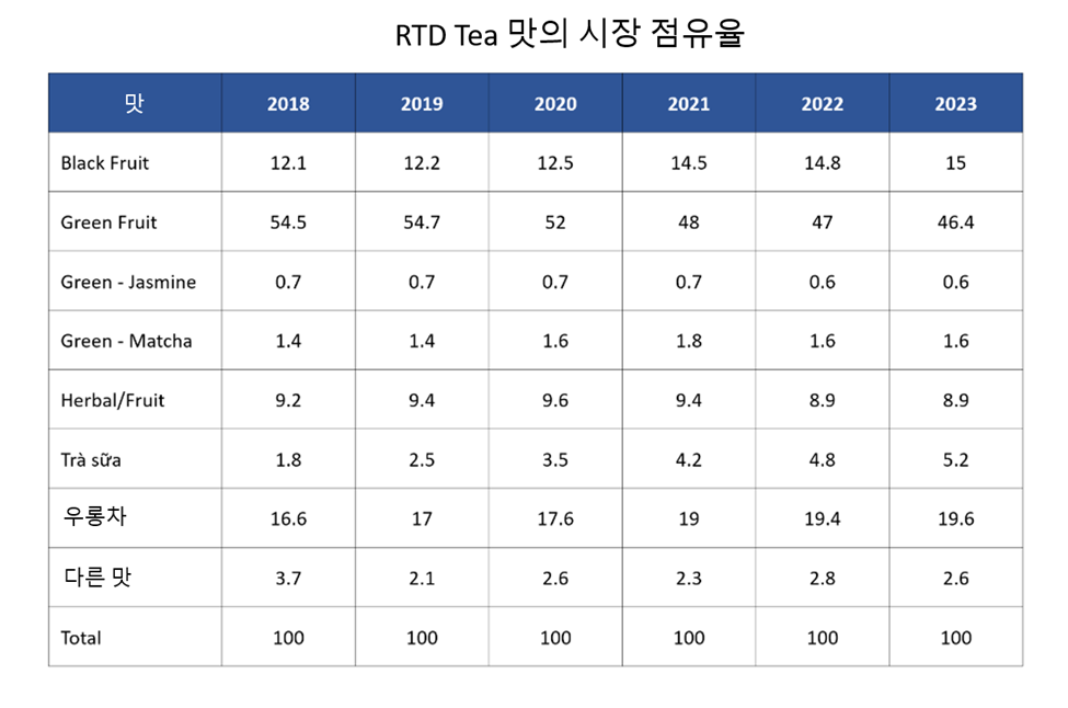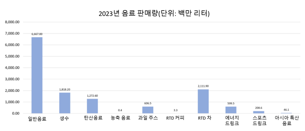 특히, Ready to drink Tea 부문(RTD Tea)은 2023년 총 소비량에서 21억 리터를 차지했으며, 전체 기간 동안 14.1%의 성장률을 기록하여 가장 큰 기여를 했다. (출처: Euromonitor, 2023년 기준).